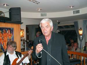 Endlich ist es soweit. Gus Backus gesteht 65 Lebensjahre ein. Aber er hüpft noch so gelenkig über die Bühne wie in seinen Glanzzeiten. Er bekannte sich als "Ami", aber auch ebenso zu seiner Liebe zu Deutschland in normalen Deutsch, aber auch in gutem Bayrisch. Herrliche Erinnerungen werden wach und bringen seine Fans, die auch nicht jünger geworden sind, in Hochstimmung. "Haben Sie schon mal den Mann im Mond gesehn?" fragt er. "Ja sicher", meint das Publikum. Als bekennender Gästdeutscher isst er gerne Sauerkraut, um gleich darauf den alten Indianerhäuptling mit seinem schweren Beruf aufleben zu lassen. Eine tolle Rock'n'Roll-Nummer fehlt nicht. Das Löwensteiner Publikum hat keine "Bohnen in die Ohren", sondern ist bis Mitternacht voll dabei und schwelgt in Erinnerungen an schöne Zeiten und den liebenswürdigen Entertainer.