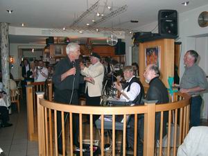 Die Jan Jankeje Connection marschiert auf. Der Bandleader humpelt auf Krücken mit Gipsfuß herein. Er hält sich etwas zurück mit seiner Bassgitarre, aber den Auftritt hat er sich nicht nehmen lassen. Oskar Klein, der Professor, moderiert mit Österreichischem Schmäh, spielt Trompete und virtuos die Mundharmonika, die vom Jodler zum Blues-Instrument mutiert. Werner Lehner bekommt für seine Klavier-Ragtimes tosenden Beifall. Wolfi Hammer ist gleich fit mit Gitarre, Gesang und Zigeunergeige. Heinz Altbart reichen bei einer Improvisation von Duke Ellingtons "Caravane" seine Schlag-Instrumente nicht aus. Wieselflink vibrieren die kleinen Trommelschlegel rund um Bühne und auf den Tischen, bis mit Trommel und Becken wieder Power aufkommt.